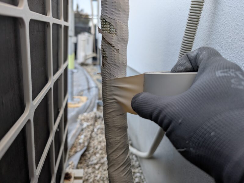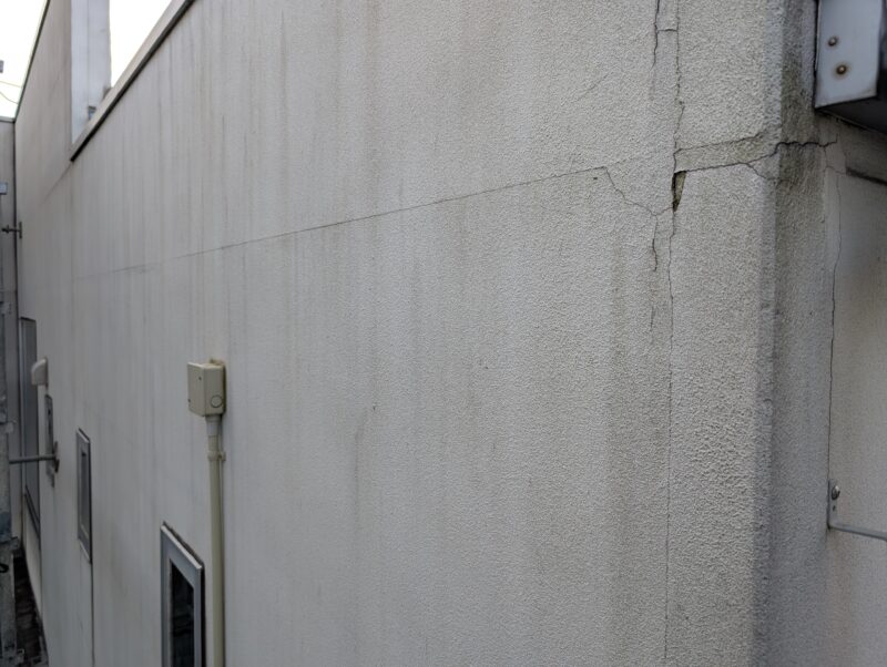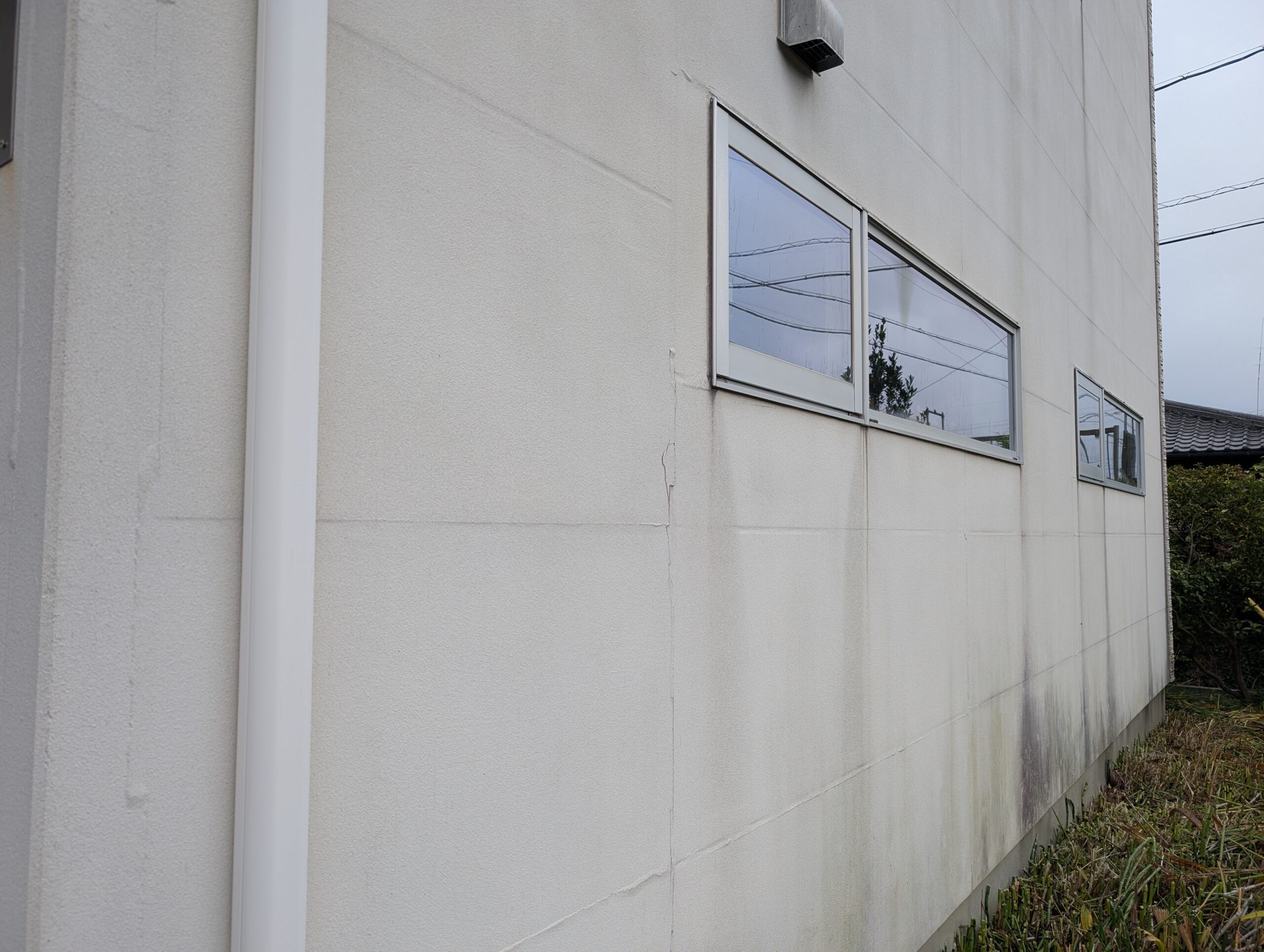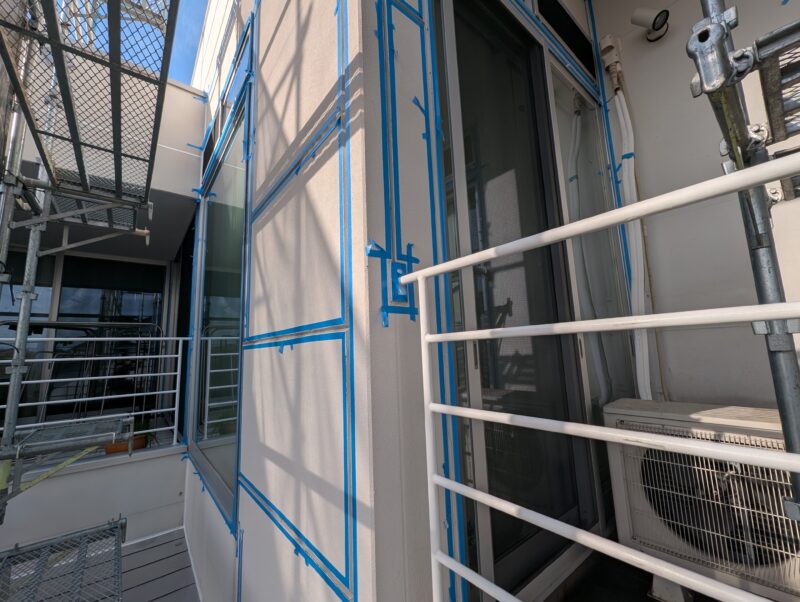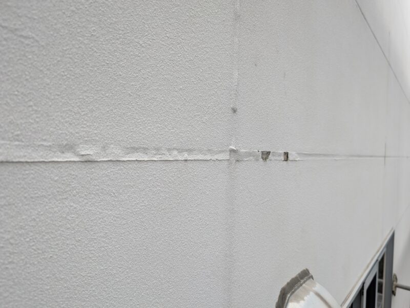 今回の住宅は、設計士さんが個別に設計をされた住宅で、ALC外壁の納まりが少々複雑な方法で仕上げられていました。具体的には、通常通り目地がシーリングで納まっている面、大壁に見せるため目地が軽量モルタルのようなもので埋めてある面の2パターンありました。前者にはシーリングの撤去打ち替え、後者にはひび割れ補修でパテ処理と柄付けにて、それぞれに合った下地調整方法で修繕を行っております。状態が悪い箇所がいくつかあったため、下地処理には特にこだわり作業を進めました。
