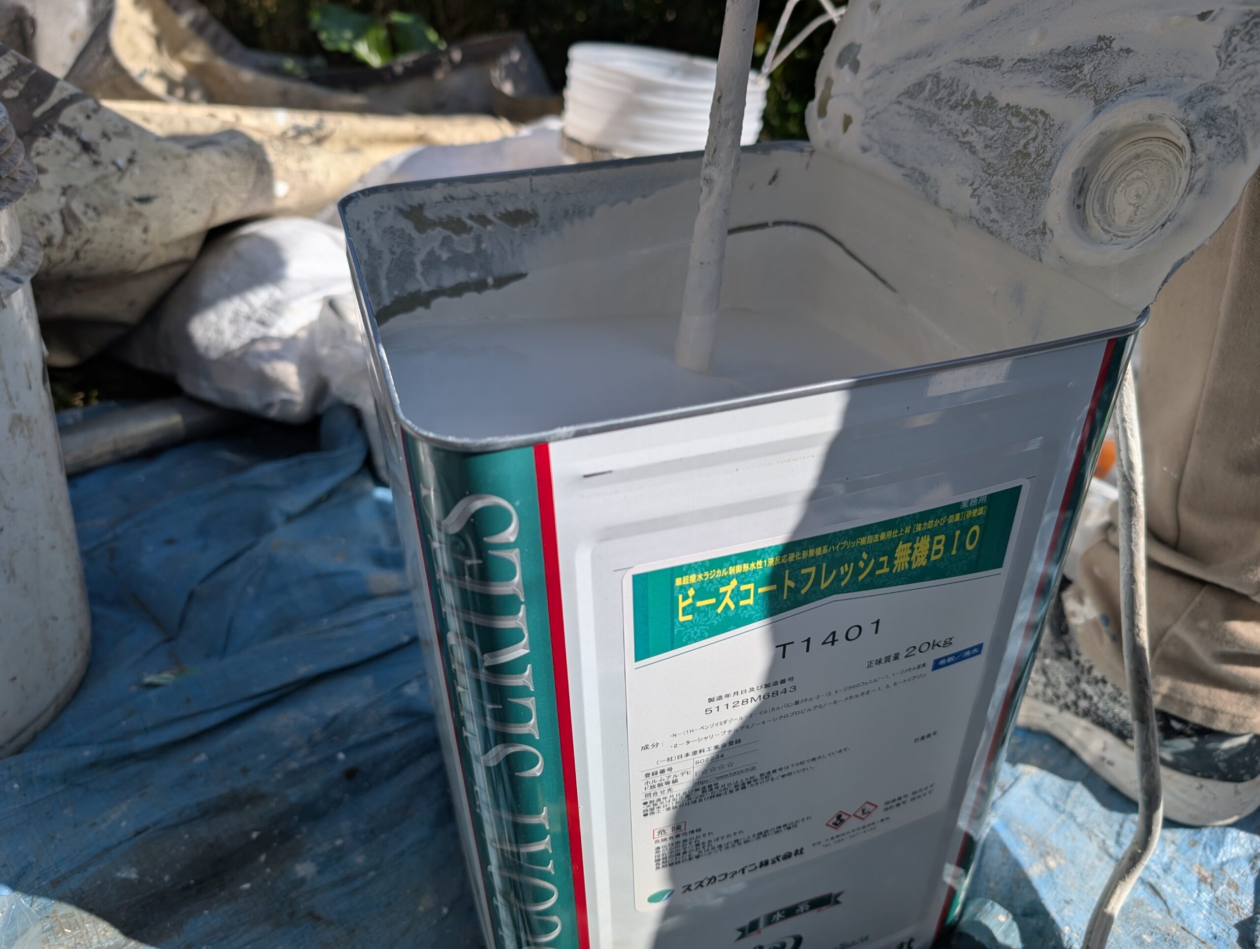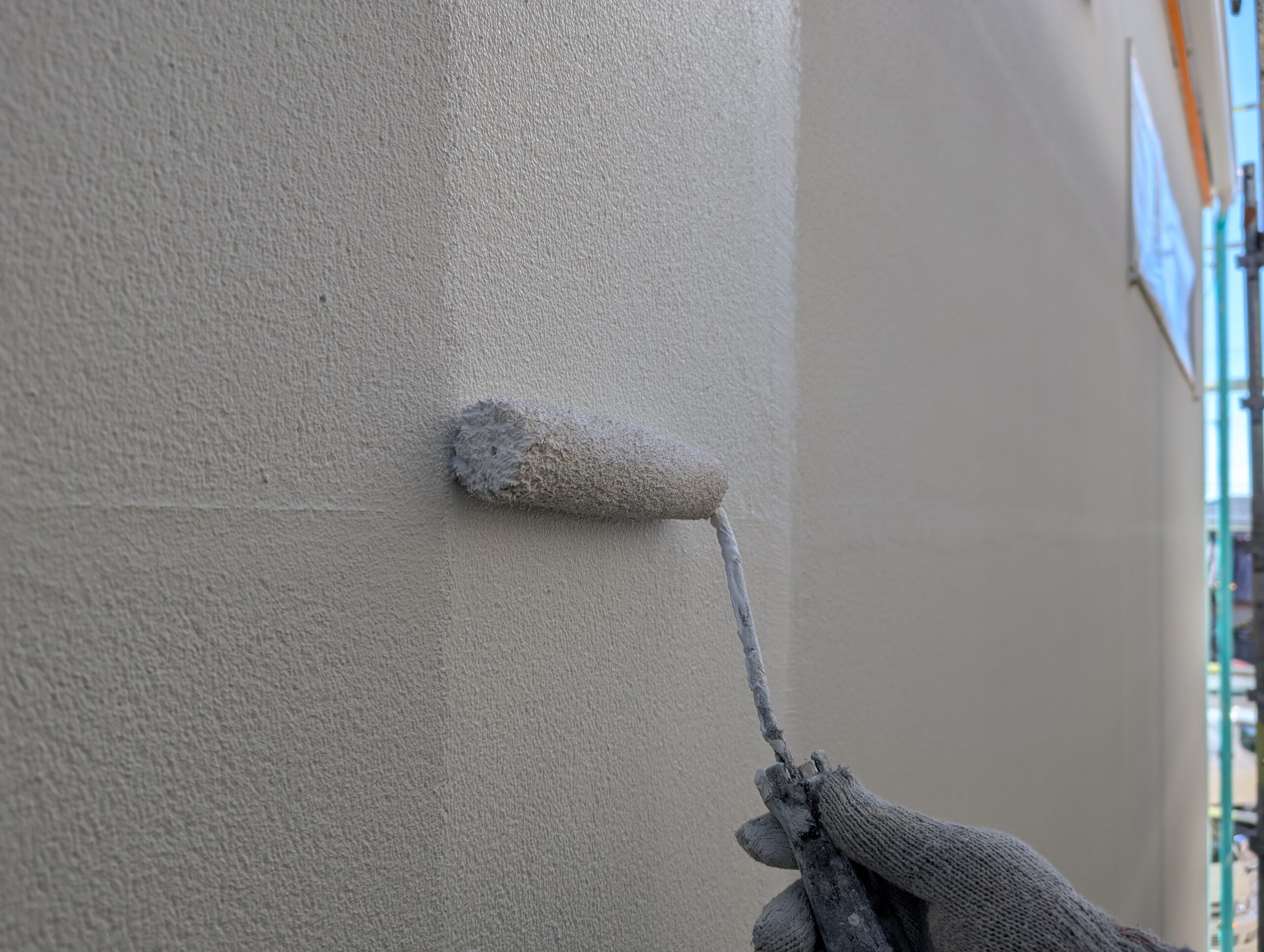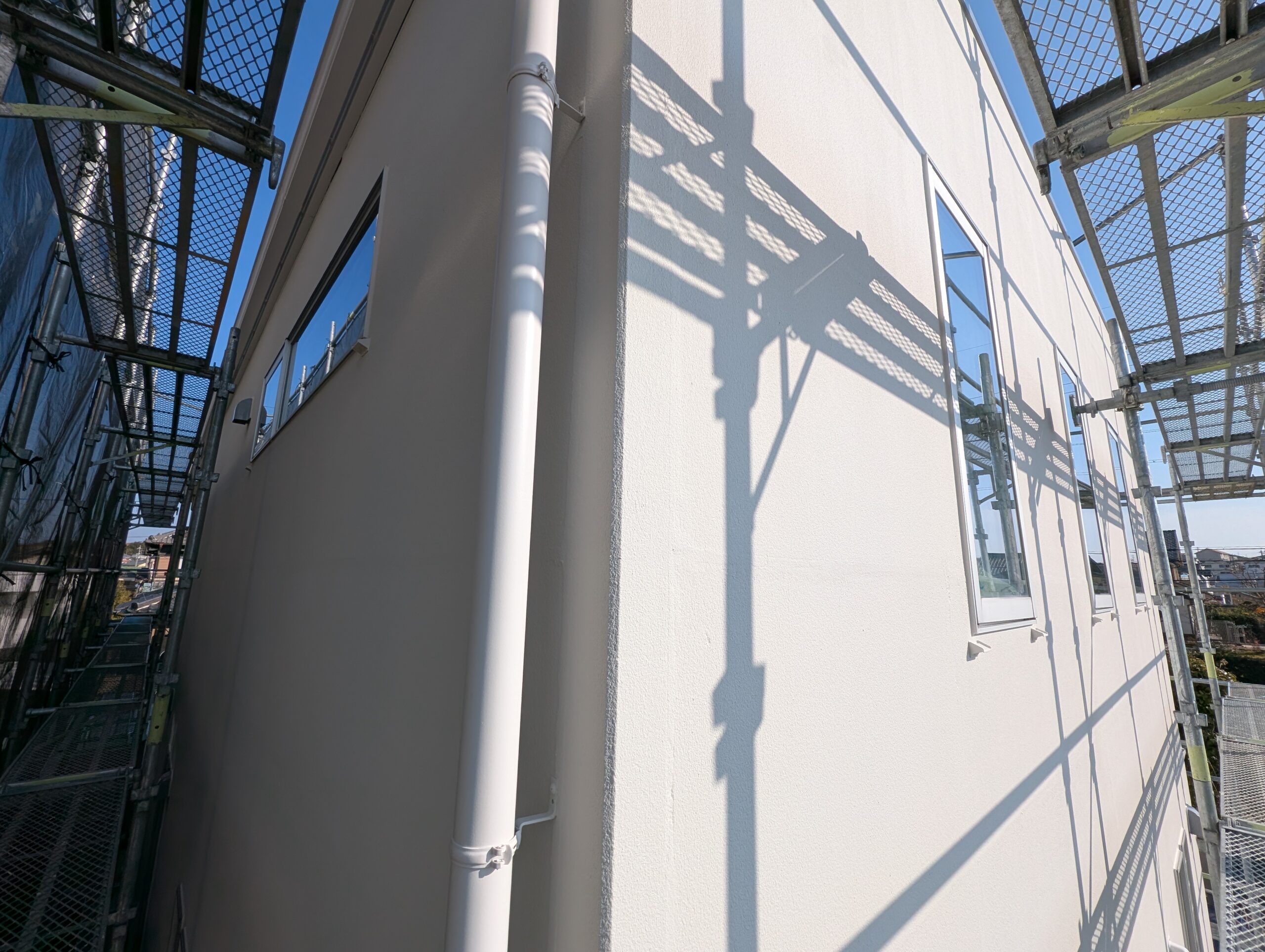 シーリングの乾燥期間は1週間以上設け、上記の下地処理を行ってから基本4回塗りにて仕上げを行いました。下塗りには別メーカーの専用下塗り材「アンダーサーフDS」を採用し、上述の「ビーズコートフレッシュ無機BIO」を3回塗り、膜厚にこだわり1年でも長く美観が長続きするよう日々努めております。
